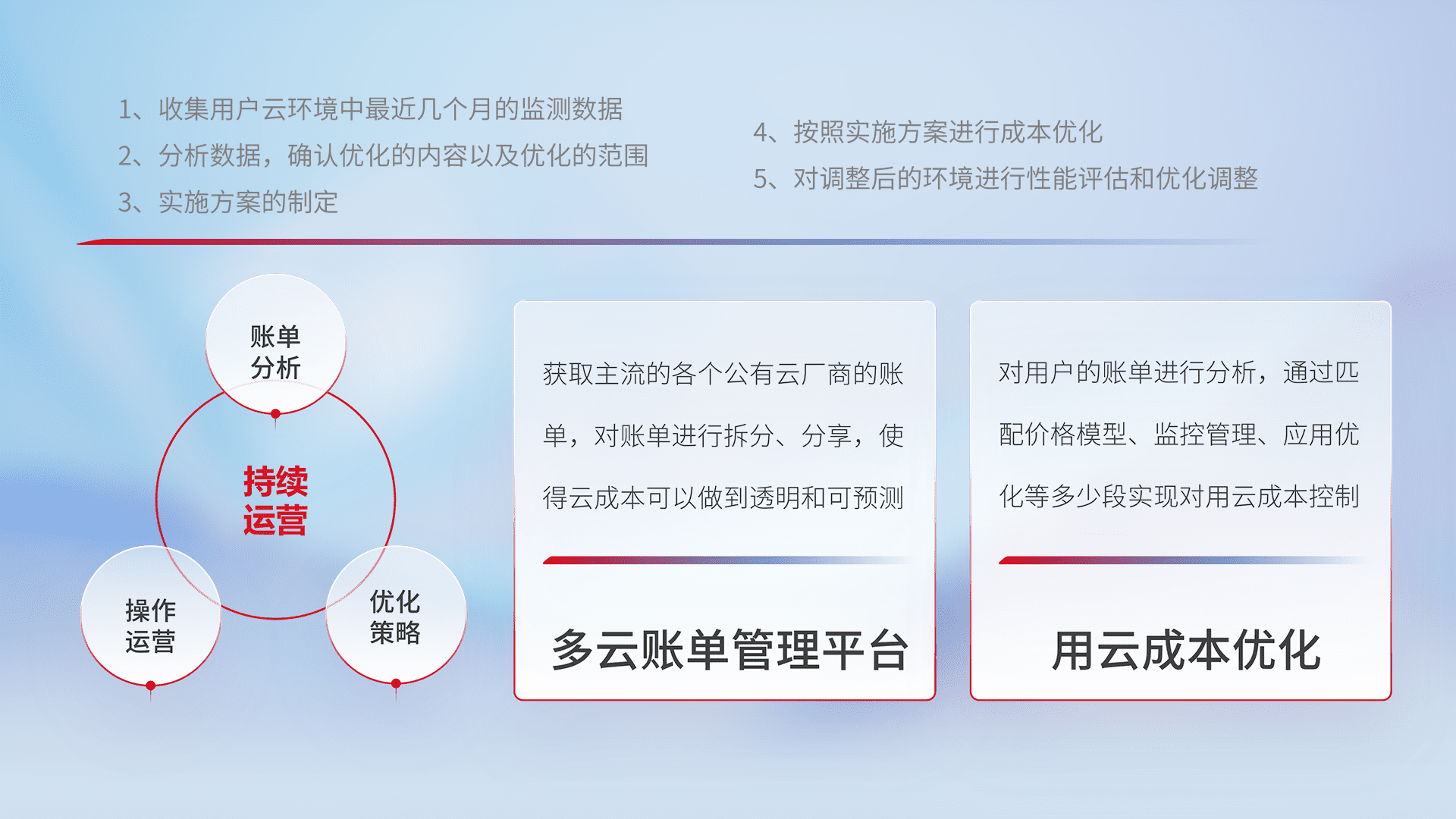 通过多云纳管,,,,以统一的资源数据模型把客户的云资源进行抽象和封装,,进而实现对多云资源的统一操作,,保障云资源管理的可靠性、、、稳定性与可用性。。。量身定制化运维内容,,,配置、、开发运维、、补丁管理、、、备份、、监控、、、认证和访问管理、、、审计和日常巡检等,,,,保障在用云过程中的可靠度,,,稳定度以及高可用率。。